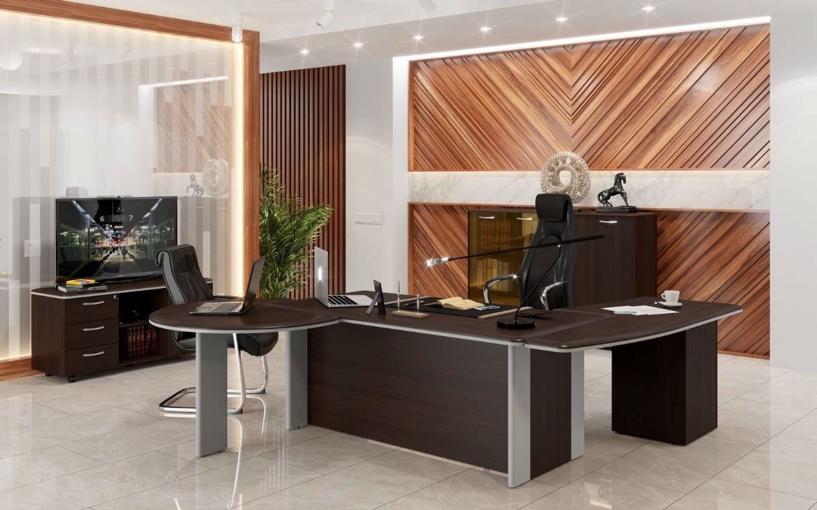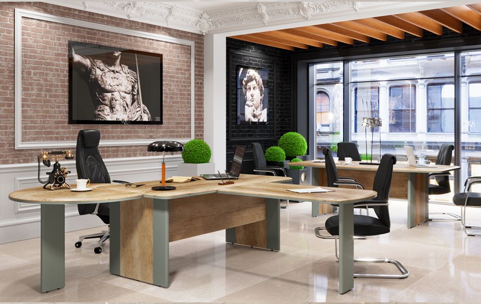 Стильный кабинет из МДФ с плавными скошенными краями основных элементов. Великолепный комфорт посадки за столом (нет острых углов!), мягкие, скругленные формы – и яркие, эффектные детали. Такие, как двухслойные столешницы или составные опоры столов, например.