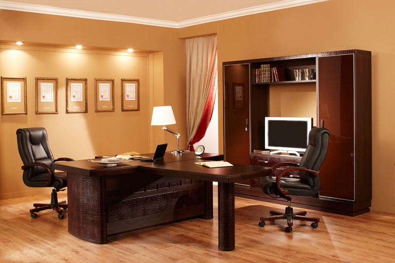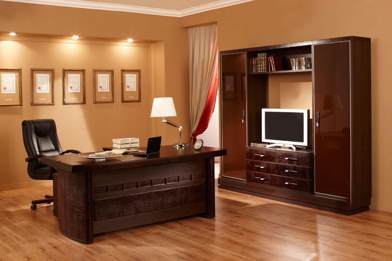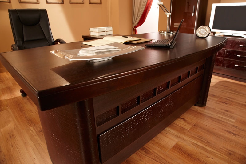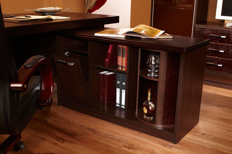 Кабинет «Дуглас» — разносторонняя и многогранная коллекция мебели для руководителя, которая уникально сочетает экзотику с основательностью. Кабинет создает ощущение роскоши и богатства. Кожей «арпатек» оформлены фасад стола, тумбы и элементы стенки.