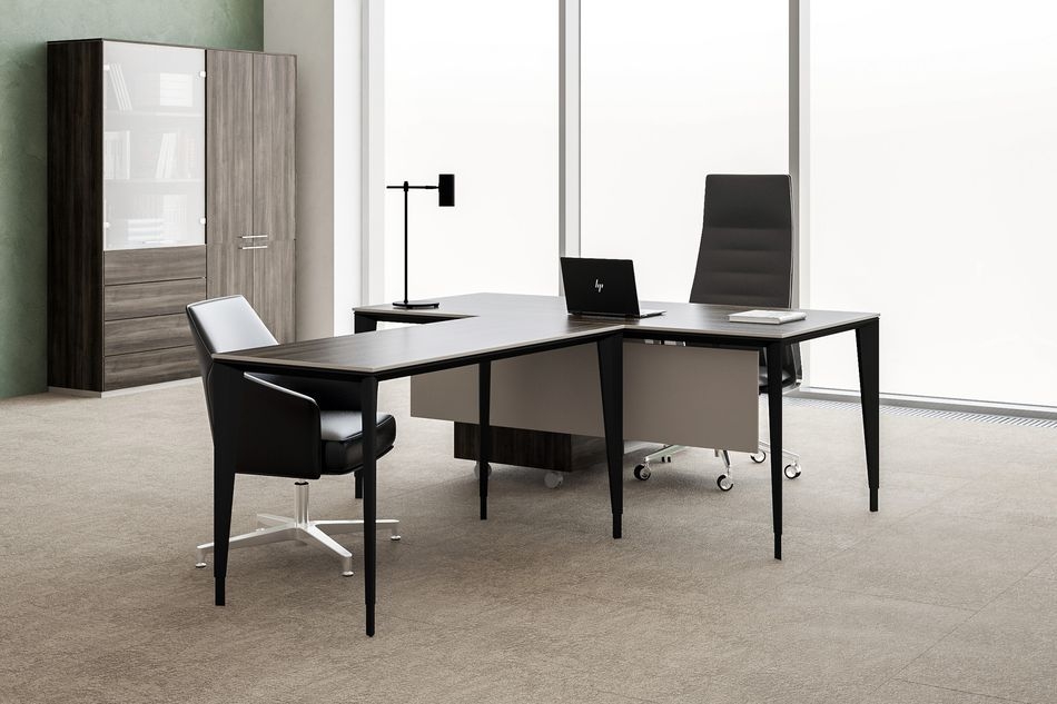 Визуальная легкость и оригинальный дизайн подчеркиваются уникальной формой ножек столов, сужающихся книзу. Это не только исключительная особенность дизайна, но и еë функциональная составляющая, обеспечивающая выравнивание мебели на полу и эстетичное размещение кабелей, которое можно осуществить прямо через ножки или через кабель канал.