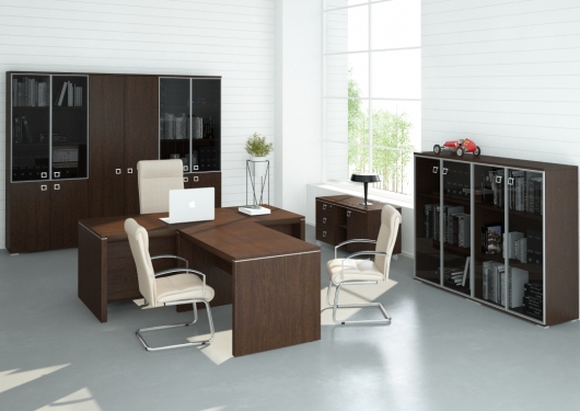 Шкафная группа представляет собой высокие шкафы, увеличенные по габаритным размерам. Высота шкафов 220 см при ширине 90 см с полками толщиной 25 мм для исключения прогиба. Вы можете выбрать понравившийся вариант стеклянных дверей – прозрачное стекло или более статусный вариант – матированное стекло «сатин» в обрамлении алюминиевого профиля. Кабинет «Cosmo» включает в себя все необходимые элементы мебели для эффективной работы современного руководителя, в подтверждение тому широкий модельный ряд столов руководителей от 160 см до 200 см для кабинетов различных площадей. Два варианта приставных столов 80 см и 130 см для любых длин рабочих столов.
