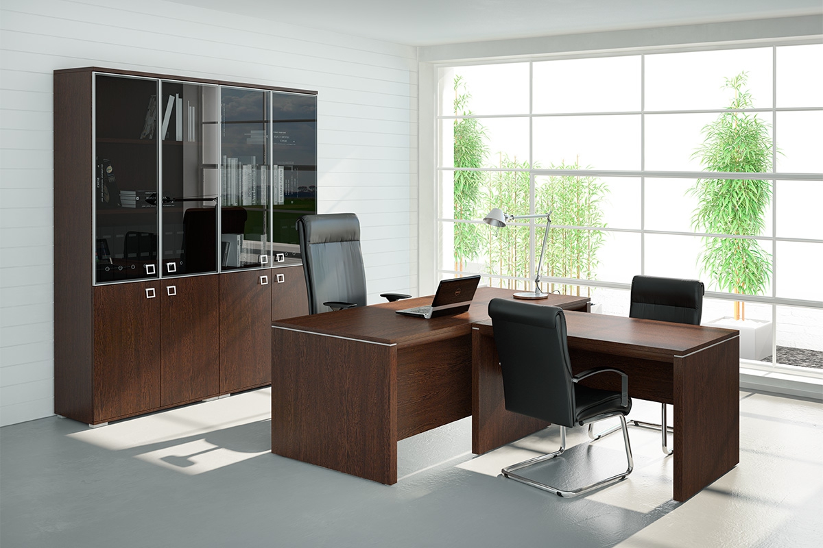Серия «Cosmo» рассчитана на тех, кто предпочитает динамичный стиль руководства и не боится экспериментировать в оформлении своего рабочего пространства. Дизайн моделей строится на сочетании элементов классики и основательности, что придает мебели особую элегантность и узнаваемость стиля. «Cosmo» – это кабинет современного делового человека. Этот кабинет одинаково хорош и для больших помещений, и для скромных по площади офисов. Отличительной чертой коллекции являются добротные массивные столешницы столов толщиной 75 мм, выполненные с использованием МДФ профилей в цвет мебели, которые придают статус и фундаментальность кабинету в целом. Декоративные вставки серебристого цвета, разделяющие визуально опоры стола от столешницы, придают кабинету современный внешний облик, они же получили широкое применение и во всех тумбах кабинета, сочетаясь с лицевой фурнитурой кабинета, в том числе с опорами шкафов и колесными опорами тумб, выполненными в аналогичном цветовом решении.