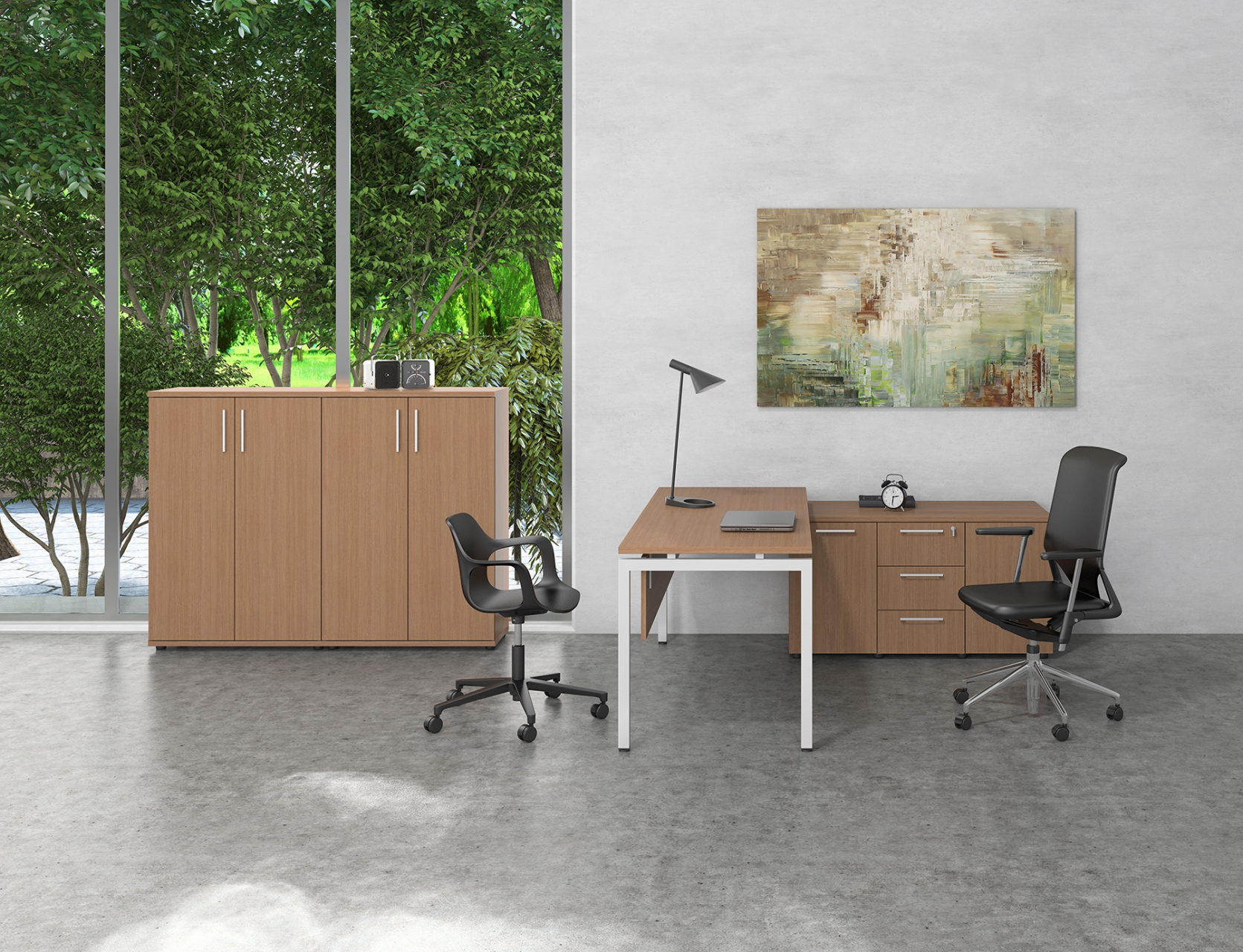 Кабинетная серия лаконичностью «Старк» – предлагает широкие функциональные возможности в комплексе с визуальной легкостью. Кабинет для любителей минимализма и легкого, «открытого» рабочего пространства. Эффект легкости достигается благодаря лаконичному металлокаркасу и трендовым древесным декорам. Дизайн строится на простоте и геометрической четкости линий. В коллекции предлагаются широкие возможности для создания переговорных зон и комнат для заседаний.