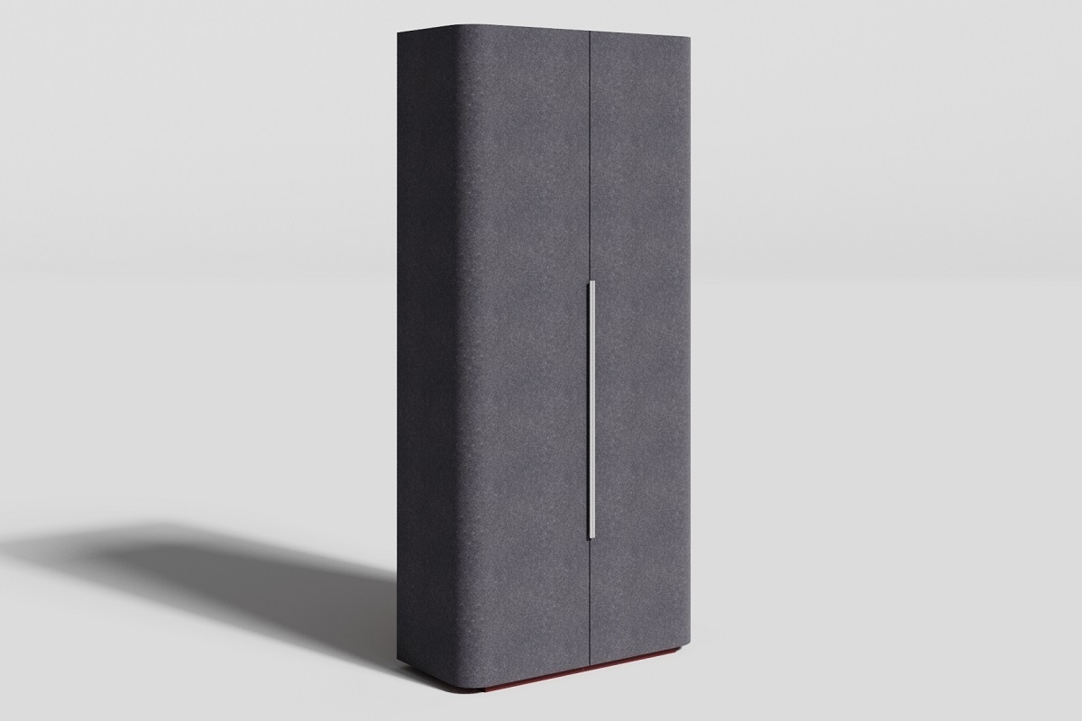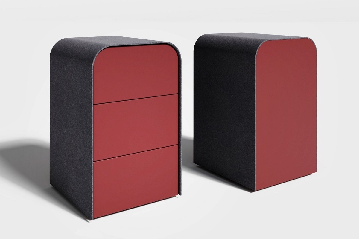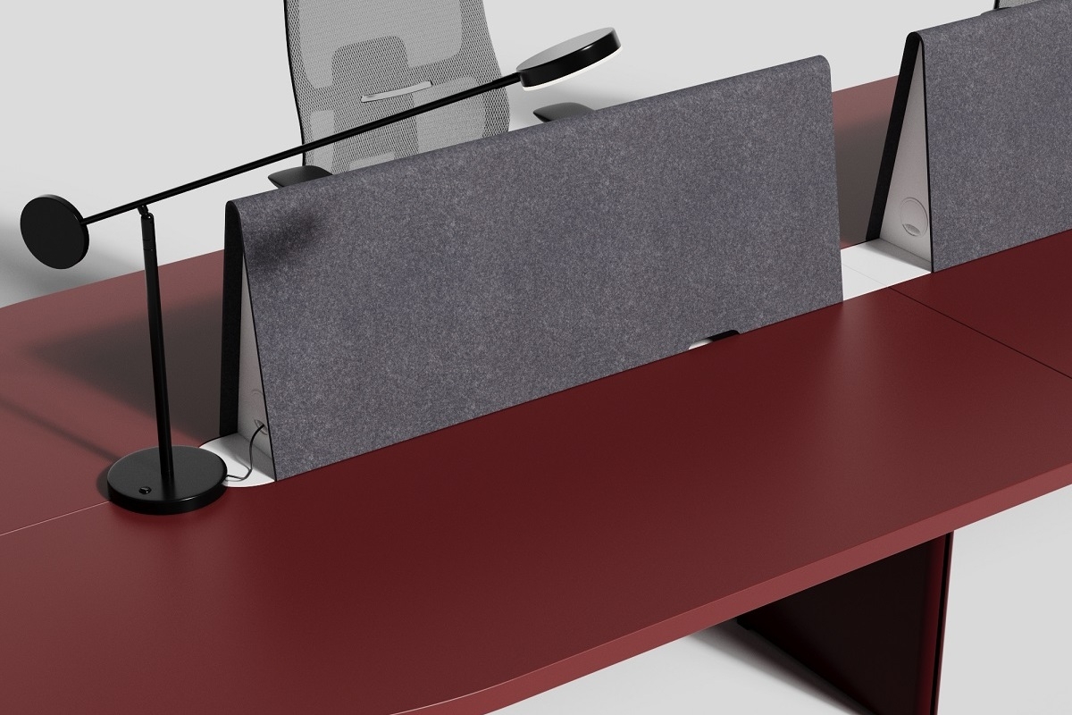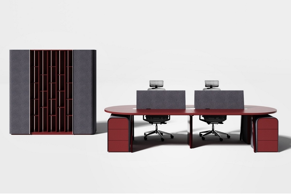 Приставные тумбочки по бокам и сверху обтянуты "лентой" серого фетра. В шкафах коллекции фетр используется для покрытия всех фасадных поверхностей, за исключением открытых секций. В результате шкаф, на контрасте с красным письменным столом смотрится необычно и впечатляет дизайном. Его открытые секции, выполненные в вишнево-красном цвете, имеют вертикальное освещение, что позволяет композиции оставаться яркой и в темное время суток, настраивая команду на победное завершение рабочего дня.