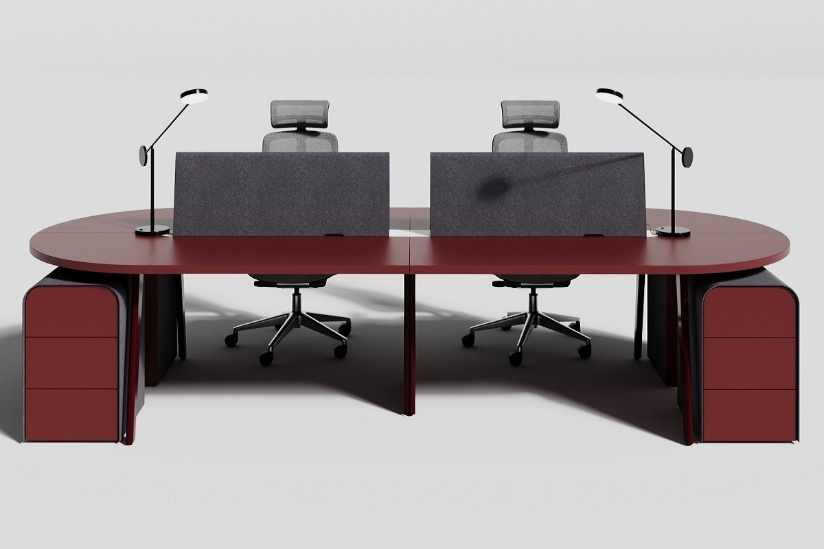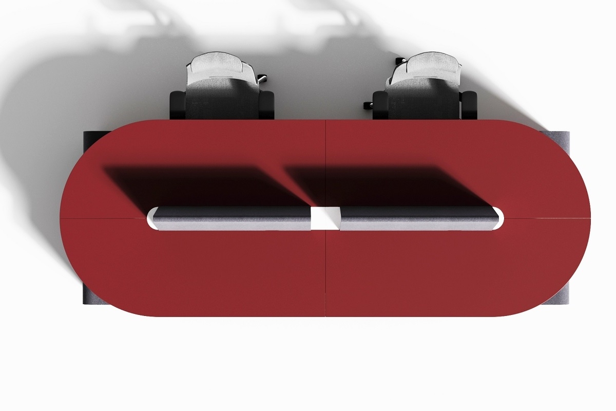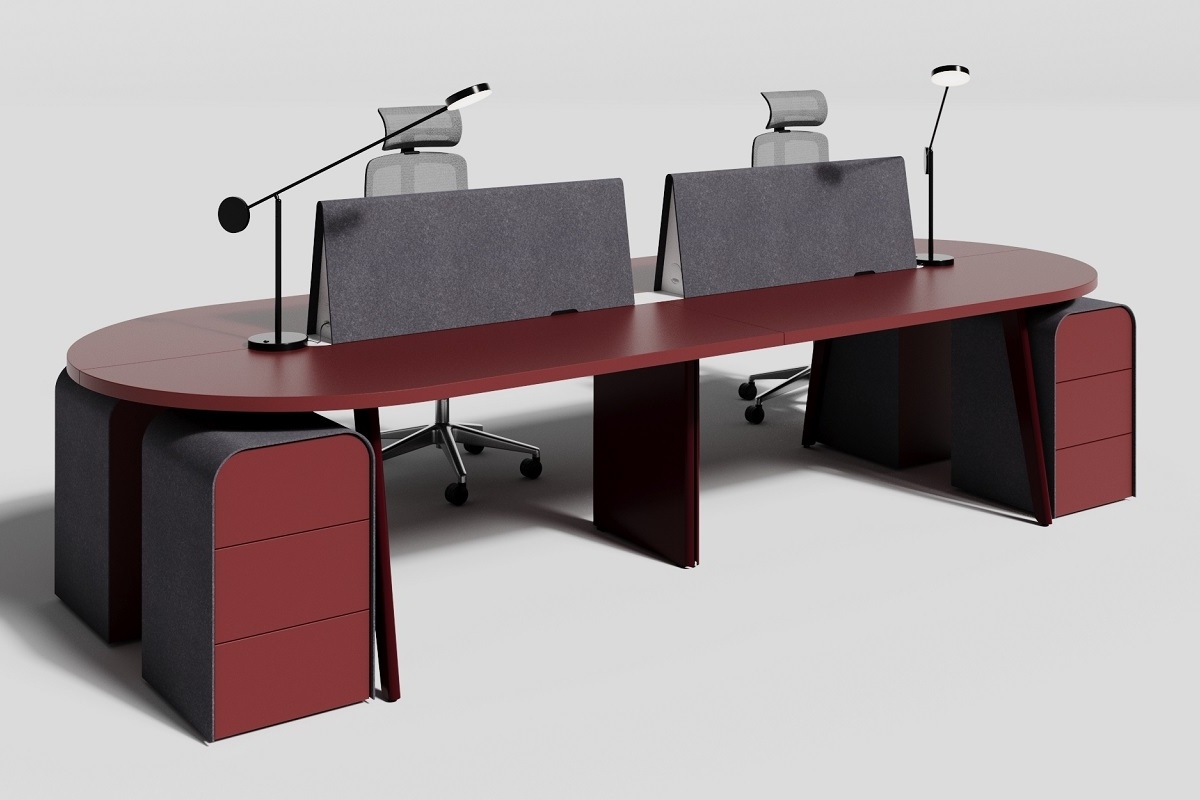 Письменный стол "Драйв Дизайн" спроектирован как бенч-система. Красная овальная столешница опирается на металлические опоры со скругленными ножками, идущими кверху под углом. Стол имеет четыре места для работы, разделенные фетровыми экранами. Приставные тумбы необычной формы, с ярким сочетанием цвета и материала завершают композицию.